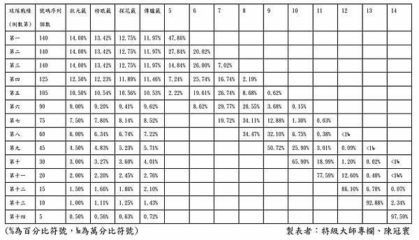 在此附上現行加權樂透選秀系統之機率分布表: