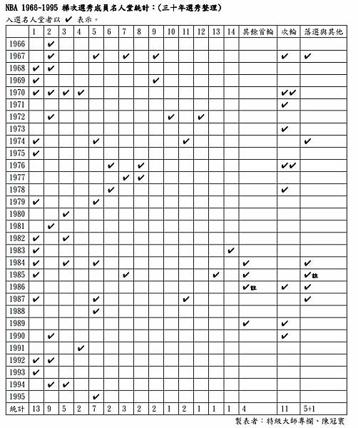 NBA 1966~1995 梯次選秀成員名人堂統計:(三十年選秀整理)