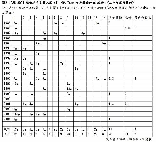 NBA 1985~2004 梯次選秀成員入選 All-NBA Team 年度最佳陣容 統計:(二十年選秀整理)
