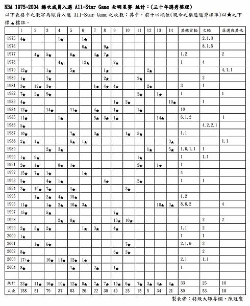 NBA 1975~2004 梯次成員入選 All-Star Game 全明星賽 統計:(三十年選秀整理)
