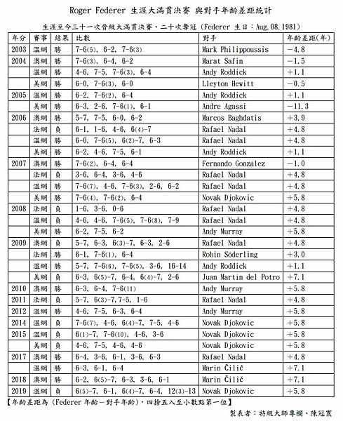 Roger Federer 大滿貫決賽對手年齡分類統計: