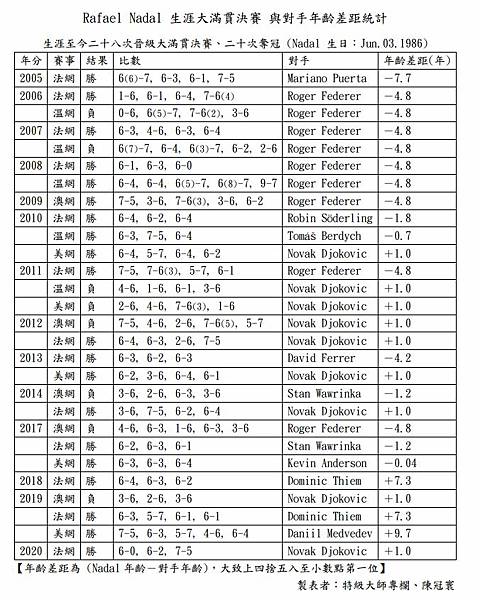 Rafael Nadal 大滿貫決賽對手年齡分類統計: