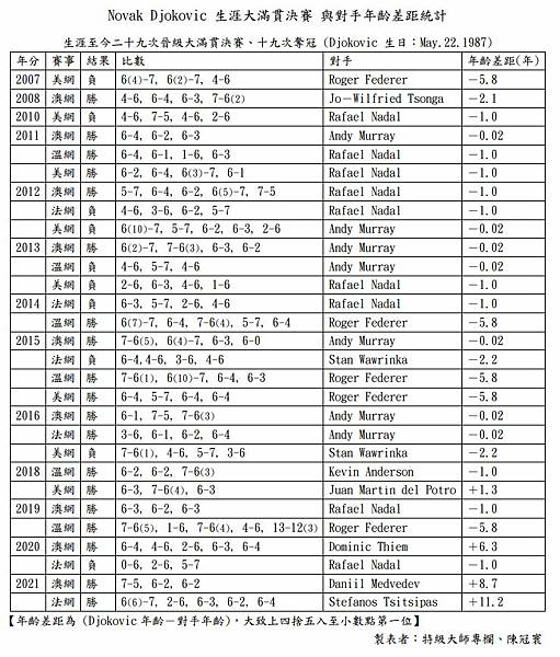 III. Novak Djokovic 生涯大滿貫決賽 與對手年齡差距統計: