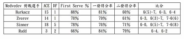四場比賽一發得分率皆逾 75%、二發得分率亦未曾低於 60%,Medvedev 優質的發球表現配上無懈可擊的擊球深度與節奏控制,讓他幾乎不可能被擊敗。
