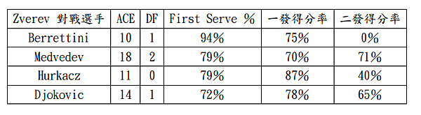 Zverev 的首位對手 Berrettini 在第二盤前期便因腹部傷勢退賽,讓他在體力消耗方面相較於其他選手更為優勢。