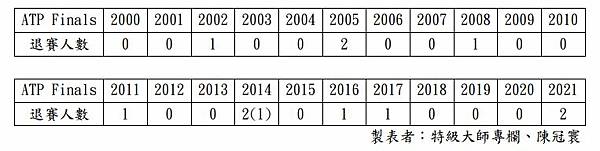 查詢2000年以來 ATP 年終賽的球員退賽情況,兩人退賽已追平最大值,不知道是否因為 2020 賽季因為疫情被迫長時間休息、2021 賽季回歸後得重新適應比賽強度而積勞成疾。