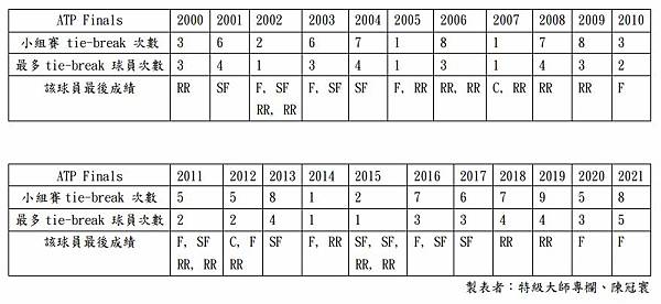 這讓筆者十分好奇每一年在小組賽階段經歷最多次 tie-break 的選手最後成績如何。在統計了2000年以來的 ATP 年終賽後,驚訝的發現 Medvedev 是這些年來在小組賽經歷最多 tie-break 的選手,其操勞程度可想而知。