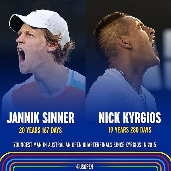 克服第四盤的賽末點、決勝盤長盤制連拿四分破發,Nick Kyrgios 驚天地泣鬼神的以 5-7, 4-6, 6-3, 7-6(5), 8-6 輸二贏三逆轉 Andreas Seppi,那時他年僅 19 歲又 280 天,仍是至今最近一位未滿二十歲便晉級澳網八強的男單選手;更令人驚豔的是這已不是 Nick Kyrgios 的大滿貫八強初體驗。