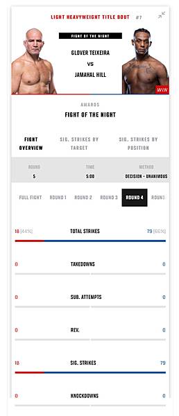 這是前述出現 10-8 的四個回合中,唯一三位裁判皆評定為 10-8 的回合,具高度參考價值。本回合並沒有出現任何 takedown, submission attempt, knockdown;而在 total strikes 方面 Jamahal Hill 以 79-18 領先(+61、比值 4.39)、significant strikes 方面 Jamahal Hill 亦以 79-18 領先(+61、比值 4.39)。