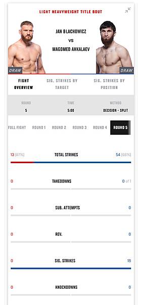 本回合有兩位裁判評定 10-8,同樣沒有出現任何成功的 takedown, submission attempt, knockdown、僅有 Magomed Ankalaev 一次失敗的 takedown 嘗試;而在 total strikes 方面 Magomed Ankalaev 以 54-13 領先(+41、比值 4.15)、significant strikes 方面 Magomed Ankalaev 更以 18-0 全面壓制。