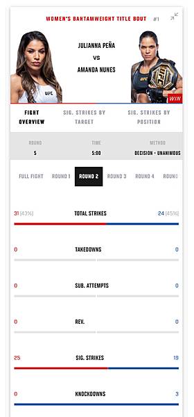 本回合僅僅有一位裁判予以 10-8 之比分,故參考價值較低。本回合 Amanda Nunes 在三次 takedown attempts 中成功兌現兩次、另有一次 submission attempt,total strikes 方面 Amanda Nunes 以 20-14 領先(+6、比值 1.43)、significant strikes 方面 Amanda Nunes 亦以 11-4 領先(+7、比值 2.75)。