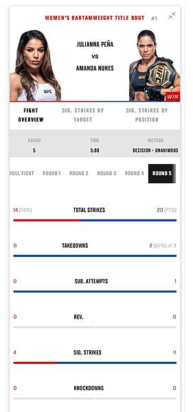IV. UFC 277: Amanda Nunes vs Julianna Peña - Round 5 (10-9, 10-9, 10-8)