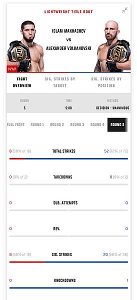 再讓我們回顧一下 UFC 284 Alexander Volkanovski vs. Islam Makhachev 的 Round 5:本回合沒有出現任何 takedown, submission attempt;但在 total strikes 方面 Alexander Volkanovski 以 52-8 領先(+44、比值 6.5)、significant strikes 方面 Alexander Volkanovski 亦以 20-8 領先(+12、比值 2.5),除此之外還有一次 knockdown。