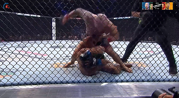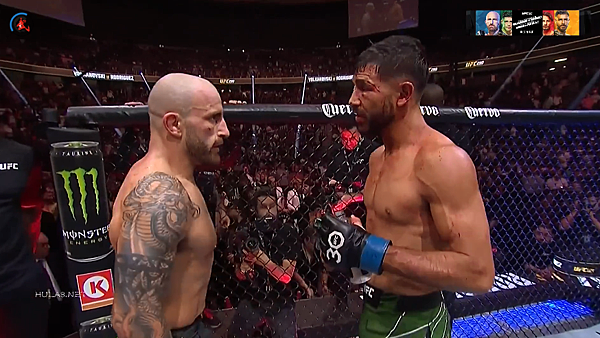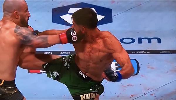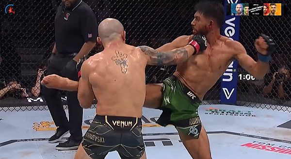 猶言如此,當比賽看似又出現懸念之時,回合時間來到 1 分 07 秒,Alexander Volkanovski 左腿低掃引誘 Yair Rodríguez 出腿,而後者也掉入被設計的圈套中、在雙方距離不遠時以右腿中掃攻擊,出腿時習慣放下雙手的破綻更被對手掌握、腿法命中的同時吃到 Alexander Volkanovski 一記精準且扎實的右勾拳,比賽瞬間邁入尾聲。