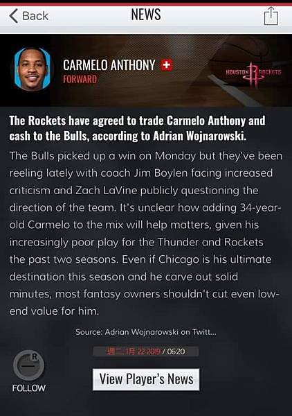 聯盟消息人士告訴ESPN,Rockets 同意將Carmelo Anthony和一筆現金送到Bulls。