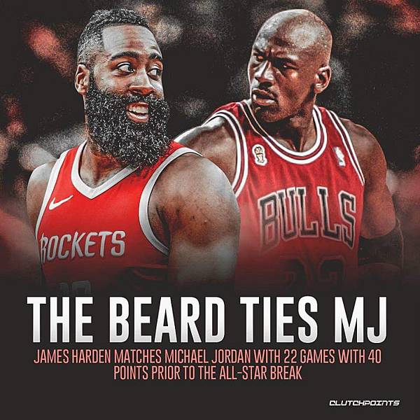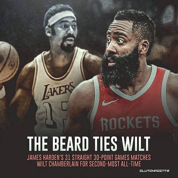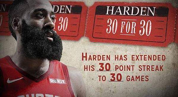 明星賽前的 Harden 已經連續31場得分至少30+且至少進1球三分,排名歷史第一;其餘分別是 Kobe 的連續15、10場與Tracy McGardy 的連續14場及 KD 的連續9場,Harden 可謂遙遙領先。Harden 在本賽季可謂紀錄收割機,除了上述的紀錄之外,還有 連續12場投進5+顆以上的三分球(歷史第二 Curry 僅連續7場);連續10場35分5助攻(歷史第二 Oscar Robertson 連續7場);歷史首位60+15籃板+5抄截;歷史首位後衛得到5X4 (對陣爵士時拿到43分12籃板5助攻6抄截4阻攻)......