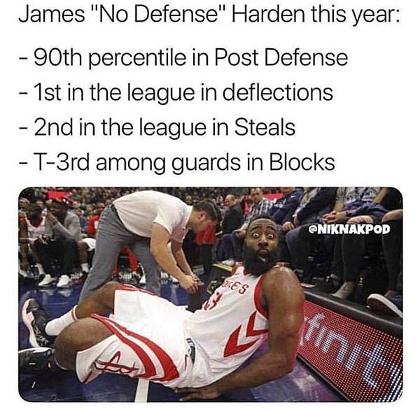 這也是 Harden 本賽季以來進步最大的地方,連防守端都化身厲鬼。你敢想像 Harden 是本賽季場均破壞對手傳球最多的球員?本賽季他場均能夠破壞對手3.8次傳球,全聯盟第一。